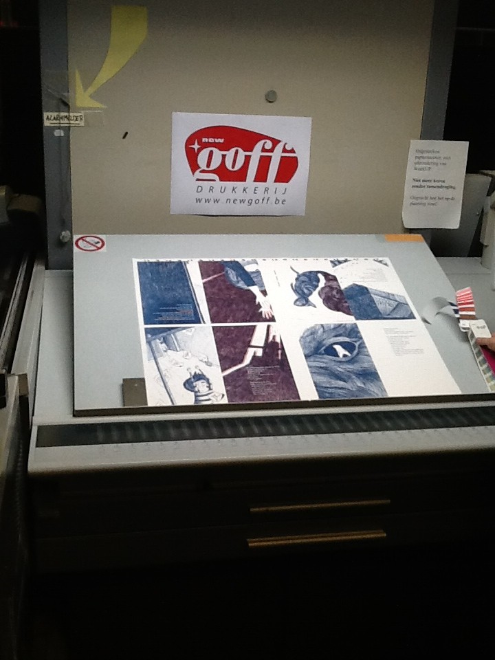 Vrijdag was Kristof bij drukkerij New Goff in Gent en heeft het sein ‘Start de persen!’ gegeven voor Nooit is voor altijd. New Goff is volgens Kristof ‘ik denk de beste boekenmaker van België’. Op de foto zie je de ‘werktafel’ van de drukker, ik weet eigenlijk niet hoe ze dat noemen, er is vast een officiële naam voor… het is de plek waar de proefdrukvellen nauwkeurig worden bekeken (soms met een loep) en getest op kleur en kwaliteit. Op het moment dat alles goed lijkt te zijn, wordt het startsein gegeven. Dan beginnen de enorme machines te stampen en is er geen weg terug.
